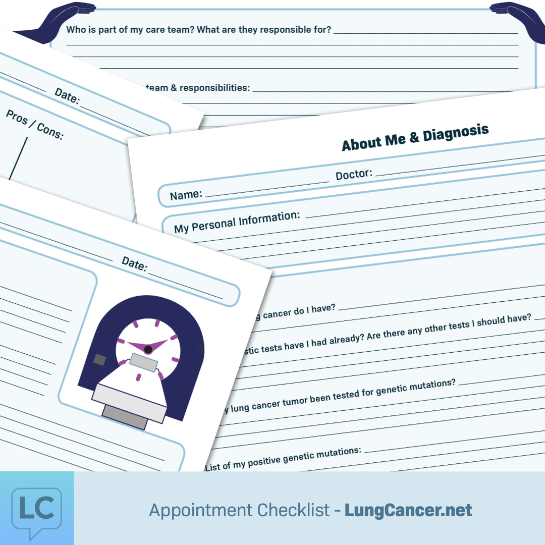 To help you keep organized and prepared for any doctor’s appointment on your calendar, we put together a printable appointment guide. This guide can help you navigate your appointments confidently as well as offer a place to log your lung cancer experiences from diagnosis onward. It includes critical questions to ask your doctor, a pro-con list to use when making treatment decisions, and a place to track treatment side effects.